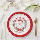 Rot-weiße Weihnachts-Party-Teller mit dem niedlichen glücklichen Weihnachtsmann, Weihnachtsbeeren und dem Familiennamen. Personalisieren Sie den Text einfach. Kate Eden Art