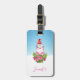 Ein Gepäckanhänger mit niedlicher und weißer Optik, der einen bezaubernden Pinguin mit roter Weihnachtsmannmütze trägt. Stehend hinter einem Strauß von Blume mit rosa und weiß gestreiften Bonbons. Schneebedeckte Winterlandschaft mit abfallenden Schneeflocken.