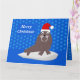 Diese phantastische Karte zeigt ein grafisches Bild eines niedlichen kleinen Weihnachtswalrus. Der Walrus hat braunes Fell mit großen schwarzen Augen und weißen Stoßzähnen. Es sitzt auf einem Eisberg mitten im Ozean und trägt einen rot-weißen festlichen Hut. Der Walrus ist umgeben von hübschen achteckigen blauen Schneeflocken, die um ihn herum fallen.