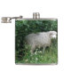 Dieser phantastische Kolben zeigt ein Foto eines niedlichen, flauschigen Schafes. Die Schafe sind von wilden Blume und langen Gras umgeben und essen einige Blätter. Es hat einen dicken weißen Wollmantel und eine niedliche schwarze Nase.