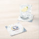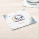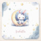 Super niedlicher Untersetzer mit niedlichem, weißem Hasen und einem wunderschönen blauen Bogen, der auf einem schönen Mond sitzt, mit goldfarbenen Sternen und dustigen blauen Wolken.