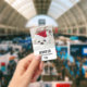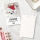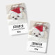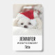 Ein Namensschild mit einem bezaubernden Foto eines niedlichen weißen Hundes mit einem roten Weihnachtshut.