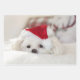 Blätter mit einem hübschen Foto eines niedlichen weißen Hundes mit einem roten Weihnachtshut.