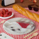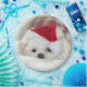Teller mit einem zauberhaften Foto eines niedlichen weißen Hundes mit einem roten Weihnachtshut.