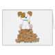 Ein niedlicher Welpe mit einem blauen Kragen und einem wagging Schwanz, sitzt auf einem Stapel der Hundekuchen.