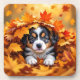 Ein niedlicher Welpenhund Herbst Thema Untersetzer. Ein süßer kleiner Hund, der in einem Haufen von Herbstblättern spielt. Er schaut wunderbar raus, während er sich im Haufen von Blätter versteckt.