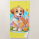 Ein Badetuch mit einem Bild eines niedlichen Welpen, der zwischen den Blume sitzt. Er sieht sehr glücklich aus, von Blume und Schmetterlingen umgeben zu sein. Das perfekte Geschenk für diejenigen, die Hunde Liebe Welpen. Enthält generativen Inhalt.
