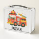 Niedlicher Whimsical Fire Truck und Feuerwehrmann Metall Brotdose