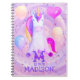 Personalisierter Name und Buchstabe Anfangsheft mit niedlicher Aquarellfarbe Unicorn mit einem Buchstaben mit fliegenden Ballons auf Aquarell lackierte Imitate Glitzer Hintergrund.