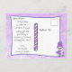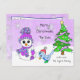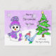 Niedlicher Whimsischer Weihnachtsschneemann lila und blau Winterhut und Milben und Vögel fressen Vogelsamen mit Weihnachtsbaum und Schneeflocken im Hintergrund personalisierte Postcard Weihnachtskarte,