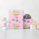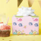 Umschlagpapier mit einer niedlichen Abbildung im Kinderzimmer mit einem Arsch gefüllt mit wilden Tieren und einem Schmetterling, der über dem Kopf fliegt, und einem freundlichen Walspußwasser unten. Einige blaue Wolken schweben vorbei. Set auf einem hellrosa, ombre Hintergrund.