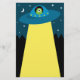 Niedliches und des Spaßes kundenspezifisches Briefpapier für die Kinder, die eine Cartoonillustration eines kleinen alien in seiner Fliegen Saucerart Raumschiff kennzeichnen. Das Raumschiff ist im Begriff, etwas oben zu strahlen. Im Hintergrund ist der Nachthimmel mit dem Mond, den Sternen und den Baumspitzen in der schwarzen Silhouette. Sie können das Briefpapier persönlicher, zum Beispiel machen indem Sie den Namen des Kindes addieren. Illustration und Entwurf durch MheaDesign. Für alle mögliche Untersuchungen betreffend den Entwurf oder die Grafik, treten Sie mit mir bitte durch meine Facebook Seite in Verbindung: www.facebook.com/MheaDesign