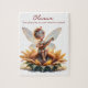 Personalisiertes Rätsel. Niedliches kleines, skurriles Anime-Mädchen, das die Ukulele auf einer Sonnenblume spielt.
