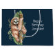 Geschenktasche mit niedlichem Aquarelldesign mit einem niedlichen Faultier, das an einem Baumzweig hängt und von grünen tropischen Blätter umgeben ist. Dunkelblauer Hintergrund.