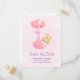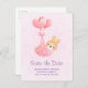 Save the Date Postkarte mit einer anmutigen Abbildung eines kleinen braunen Babyhuns mit einer winzigen goldenen Krone. Von Ballons in einer rosa Herzdecke getragen.