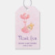 Geschenketiketten mit einer anmutigen Abbildung eines kleinen braunen Babybastes mit einer winzigen goldenen Krone. Von Ballons in einer rosa Herzdecke getragen.