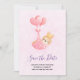 Save the Date eine Karte mit einer anmutigen Abbildung eines kleinen braunen Babybastes mit einer winzigen goldenen Krone. Von Ballons in einer rosa Herzdecke getragen.