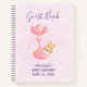 Ein personalisiertes Gästebuch mit einer anmutigen Abbildung eines kleinen braunen Babybastes mit einer winzigen goldenen Krone. Von Ballons in einer rosa Herzdecke getragen.