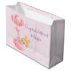 Eine Geschenktüte mit einer anmutigen Abbildung eines kleinen braunen Babyhuns mit einer winzigen goldenen Krone. Von Ballons in einer rosa Herzdecke getragen.