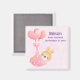 Ein Magnet für Datums mit einer ansprechenden Abbildung eines kleinen braunen Babybastes mit einer winzigen goldenen Krone. Von Ballons in einer rosa Herzdecke getragen.