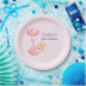Teller aus Papier mit einer hübschen Abbildung eines kleinen braunen Babybastes mit einer winzigen goldenen Krone. Von Ballons in einer rosa Herzdecke getragen.
