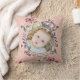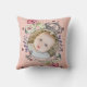 Niedliches Baby Foto Keepake Name Geburtsdatum Custom Throw Kissen. Dieses bezaubernde Design verfügt über eine Krone und Blume sowie eine Vintage Schriftrolle, die Sie anpassen können. Es hat einen rosa gemusterten Hintergrund, der wie Vintages Papier gestaltet ist. Toll, um niedliche und liebevolle Fotos von Lieben!