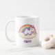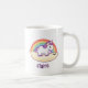 Super niedliches lila Baby, das eine glückliche Banane unter einem glitzernden Regenbogen reitet. Passen Sie Ihren eigenen Text an.