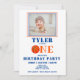 Niedlicher Basketball 1. Geburtstag Einladung mit einem Foto. Niedliche Basketball-Geburtstagskarte für den 1. Geburtstag. Das Design besteht aus einem großen Basketball und einem blau-weißen Streifen auf der Rückseite. Personalisieren Sie diesen Geburtstag mit einem Kindernamen und einem Foto und personalisieren Sie alle Daten auf der Einladung.