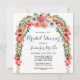 Diese hübsche Brautdusche lädt mit einem hübschen Blumenbogen direkt aus dem Garten ein. Die Blume sind pachelrosa und weiß mit botanischer Vegetation. Die Rückseite der Karte hat einen blauen Hintergrund mit hellpfirsichfarbenen Polka-Punkten. Ideal für ein Brautparty im Frühling oder ein Brautparty im Sommer.