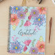 Das ist ein individualisierbares Notizbuch, das Ruhe und Eleganz ausstrahlt. Das Cover ist in einer beruhigenden hellblauen Farbe überwältigt und dient als Leinwand für einen aufwändigen Blumendruck. Eine Reihe von Blume in sanften Pastelltönen von Korallen, lila und rosa sind künstlerisch über den Deckel verteilt, wodurch ein harmonischer Farbtanz entsteht. Diese Blüten werden durch zarte grüne Blätter verschiedener Größen verstärkt, die dem Design eine Touch der Eleganz der Natur verleihen. Im Mittelpunkt des Notizbuches stehen die Worte "Dankeschön Journal" in einem stilvollen, kursiven Schriftart. Diese zentrale Inschrift lädt die Anwender ein, ihren täglichen Dank inmitten dieses blühenden Gartens voller Ruhe zu entfalten. Das Notizbuch verfügt über eine Spiralbindung an der links Seite und verleiht der ästhetischen Optik eine praktische Touch.