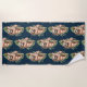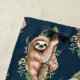 Ein Badetuch in niedlicher Aquarellgestaltung mit einem niedlichen Faultier, das an einem Baumzweig hängt und von grünen tropischen Blätter umgeben ist. Dunkelblauer Hintergrund.