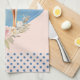 Küchenhandtuch mit hübschem Braun mit weißem gepunktetem Rücken. Ein kleiner Vogel sitzt auf dem Rücken des Hirsches. Ein extravagantes Blumenstrauß mit Aquarellfarben-Rose und hellolivgrüne Blätter unter den Füßen des Hirsches. Ein blaues Aquarelleck hinter dem Bild. Ein polka Punkt Rand oben und unten. Innozentes und süßes Design mit rustikaler Eleganz. Pfirsichfarbener Hintergrund