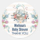 Baby Dusche danke Ihnen Aufkleber mit einer Abbildung mit Aquarellfarben erstellt. Ein niedliches Hasen, das ein blaues Kleid trägt und in einem Korb sitzt, umgeben von ihren Eiern. Schmetterlinge flattern um den Korb, der mit einem extravaganten Blume-Bouquet dekoriert ist. An den Seiten blauen und rosa Tulpenfloralen.