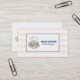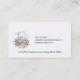 Berufliche Visitenkarten mit pfirsichgestreiftem Hintergrund und einem überlagerten Rahmen. Entworfen mit einer Illustration erstellt mit Aquarellfarben. Ein niedliches Hasen, das ein blaues Kleid trägt und in einem Korb sitzt, umgeben von ihren Eiern. Schmetterlinge flattern um den Korb, der mit einem extravaganten Blume-Bouquet dekoriert ist.