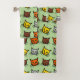 Ein hübsches Badtuch-Set, das einen niedlichen katzenartigen themed Musterentwurf der gelben, orange, grauen und braunen Katzengesichtsillustrationen gegen einen kundenspezifischen Farbhintergrund kennzeichnet. Sie können die Tücher einzeln, indem Sie besonders anfertigen "klicken, personifizieren" oder "fertigen Sie" Knopf besonders an, um die gewünschte Hintergrundfarbe vorzuwählen.