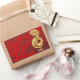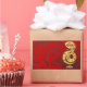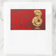 Golden Tradition Chinesisches Papier geschnitten aus einer niedlichen Schlange als zentrales Motiv mit dem gleichen Papierschnitt in großer und dunkelroter Farbe + Grosses chinesisches Ideogramm der Schlange als Hintergrund. Design auf einem horizontalen rechteckigen Aufkleber. Matching Grußkarte und Urlaubspostkarte. Perfekt für das chinesische Neujahr der Schlange 2025.
