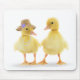Niedliches gelbes Entenpaar mit Hut und Perlenhalskette auf weißem Hintergrund.