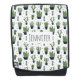 Ein personalisierter Rucksack mit rustikalem Western-Geschmack. Entworfen mit einem Haufen niedlicher grüner Kakteen in einem sich wiederholenden Muster. Insbesondere grün gefärbte Kakteen in allen möglichen Formen und Größen, die jeweils in ihrem dunkelblauen Blume-Topf sitzen. Kleine dekorative Dreiecke dazwischen. Whimsical lustige Illustration.
