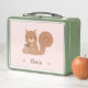 Eine niedliche Lunchbox mit einer Abbildung eines kleinen Eichhörnchens, das an einer Eichel festhält. Personalisieren mit dem Namen des Kindes. Die hellrosa Hintergrundfarbe kann im Anpassungsmodus geändert werden.