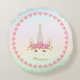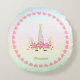 Niedliches Einhorn mit Blume, Herzen und Goldkonfetti auf pastellfarbenem Hintergrund Rundkissen. Name kann personalisiert sein. Ideal für ein Geschenk!
