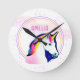 Niedliche Einhorn Magical Stars Mädchenname Runde Uhr. Diese schöne und magische Uhr wird das Kinderzimmer noch zauberhafter machen! Personalisieren Sie es mit einem Namen Ihrer Wahl und lassen Sie Ihre Kleinen sich besonders fühlen. Die Uhr ist mit einem niedlichen Einhorn gezeichnet.