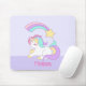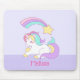 Ein personalisiertes Mousepad mit einer Illustration eines niedlichen und kawaii Einhorns, das friedlich mit einem extravaganten, lockigen Mann und Schwanz schläft. Ein farbenfroher Regenbogenschütze über ihrem Kopf. Der untere Teil hat einen Rahmen, der aus weißen Polka-Punkten auf einem lila, hellen Hintergrund besteht. Adorable mädchenhafte Gestaltung.