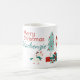 Diese Kaffee-Tasse bietet ein buntes Märchenthema. Ein festliches Einhorn wird neben einem Weihnachtsbaum und Geschenken stehend abgebildet. Eine niedliche kleine Fee flattert neben dem Baum. Ein Beispiel Frohe Weihnachtsgrüße wird in einem skurrilen roten Schriftart über dem Einhorn gedruckt, gefolgt von einem Namen in grün. Sie können die Tasse so gestalten, dass sie Ihren eigenen individuelle Name und Text enthält.