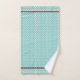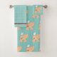 Set mit Badehandtuch, Badehandtuch in Aqua mit niedlichen pfirsichfarbenen Elefanten überall. Das Handtuch wird in einem Aqua- und Weißpolka-Dotmuster gemacht, und das Waschlappen ist ein festes Aqua mit einem großen niedlichen Elefanten. Das Set ist für ein kleines Kinderbad geeignet.