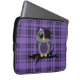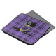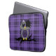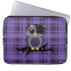 Custom Neopren 13 Zoll Laptop Sleeve mit einem Vektorgrafik-Design einer niedlichen lila, grauen und schwarzen Eeule mit Haaren und einem lila Schädelbogen sitzend auf einem Ast mit gebrochenem Herz und einem lila karierten Muster Hintergrund.