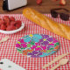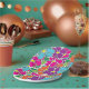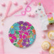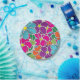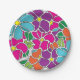Dieser lebendige Blumendruck sieht aus wie ein modernes Buntglas mit seinen weißen Linien um die Blume und Blätter. Die Farbtöne Rosa, lila, Orange, aquamarin und Grün in den Blätter.