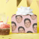 Einfache Vorlage. Laden Sie alle fest zugeschnittenen Seiten eines Objekts hoch, ohne den Hintergrund zu entfernen (viele Telefonanwendungen sind verfügbar), und Sie können Geschenke im Gesicht, in der Katze oder in jedem beliebigen Objekt des Empfängers einwickeln. Set auf solidem, blassrosa Hintergrund