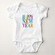 Feiern Sie das neue Jahr mit Ihrer Familie und Freunden mit diesem farbenfrohen und niedlichen Design, das einen großen Text enthält, der "Happy New Year" mit Buchstaben in blau, orange, grün, gelb, fuchsia, aqua und lila.