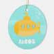 Ein entzückender Cartoon eines gelben Unterseeboots mit blauen Fensterscheiben und -blasen, die von der Seite herauskommen. Hintergrund der blauen Welle zeichnet, um zu veranschaulichen, dass das Unterwasserhandwerk underwater versenkt wird. Dieser attraktive und niedliche Entwurf mit ruhigem Blau und Touch des Gelbs ist für Babys und Kleinkinder ideal. Diese Babyverzierung ist das Geschlecht, das als dekoratives Stück für Neugeborene und Babypartys neutral und wunderbar ist. Personifizieren Sie leicht mit dem Namen des Jungen.