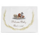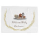 Niedlich gepolstertes Tiergedächtnis zeigt das Bild von liebevoll gestopften Tieren, die sich zusammen versammelt haben, um Baby willkommen zu heißen. Ihre persönliche Nachricht wird unter dem Bild in einem goldbraunen dekorativen Schriftart angezeigt. Entworfen, um die Niedlich gepolsterten Baby-Dusche Einladungen und Accessoires zu begleiten.